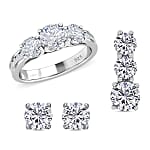 Doorbuster Moissanite Trilogy Ring Stud Earrings and Pendant in Rhodium Over Sterling Silver 6.20 ctw