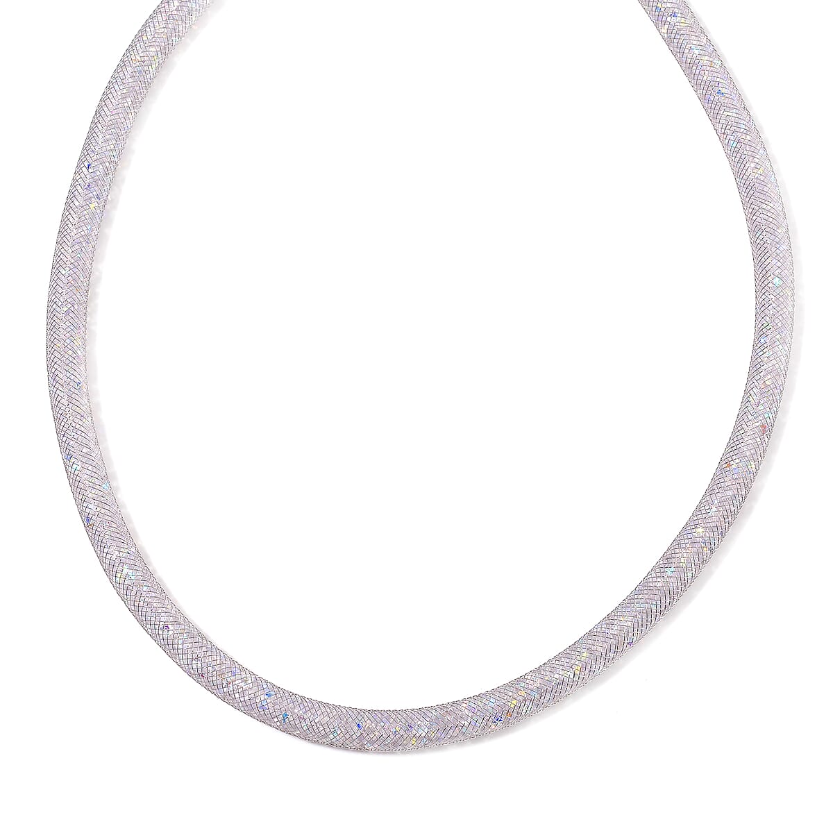 This Austrian crystal necklace features an intricate fishnet tube design filled with sparkling crystals. This 20 inch necklace artfully combines rugged texture with the delicate brilliance of the crystals, creating a striking visual contrast.