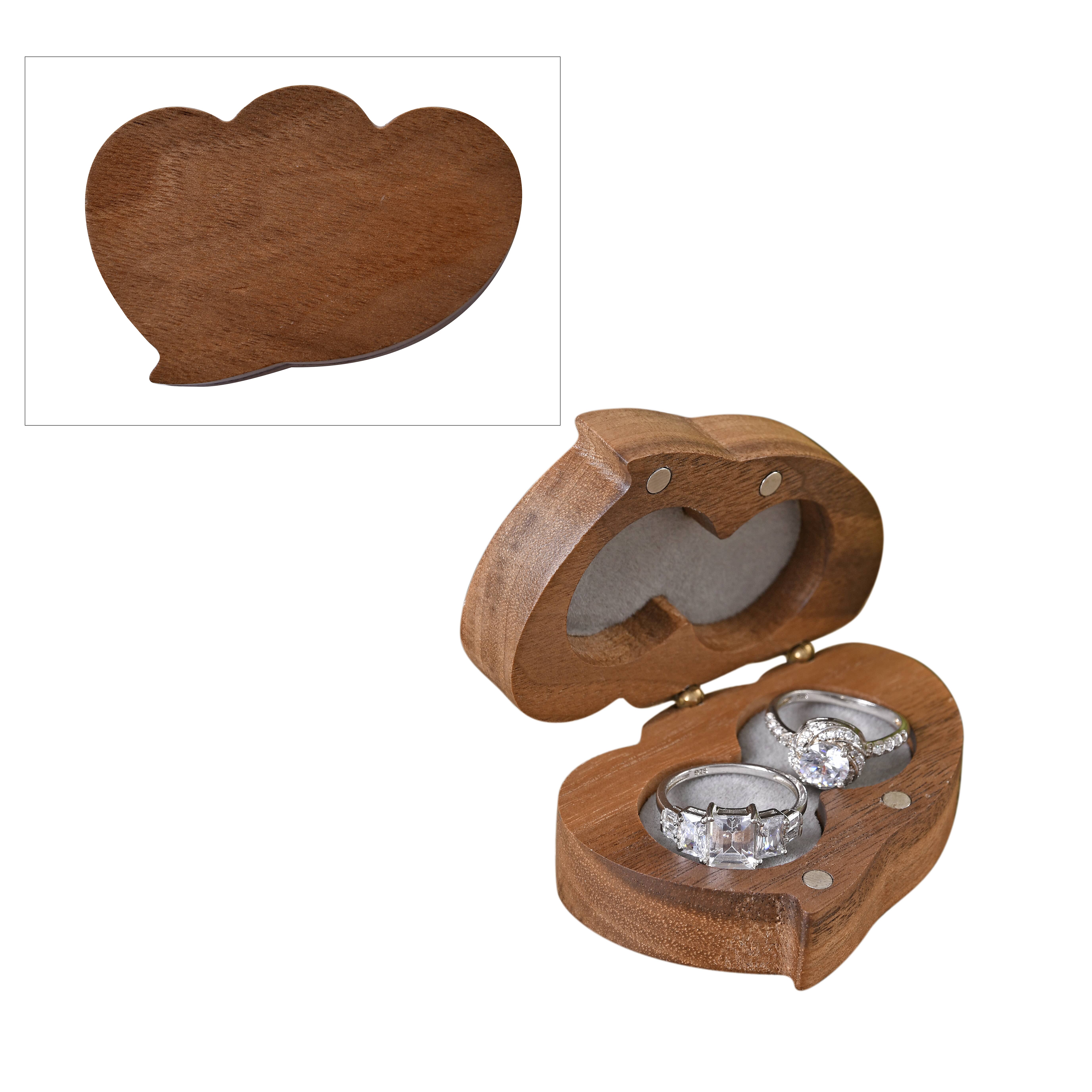 This double heart shape walnut jewelry ring box is crafted from rich walnut wood, featuring a unique double heart design that offers a romantic touch for presenting rings. This meticulously designed jewelry box protects precious jewelry with its soft interior lining.