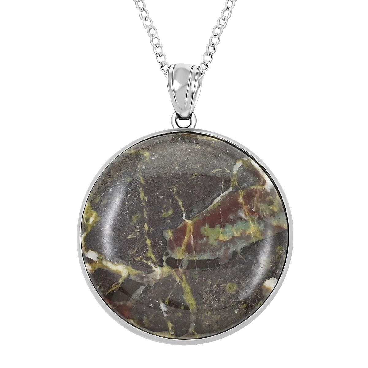 Dragon Blood Jasper Round Pendant Necklace 18 Inches in Silvertone 14.30 ctw