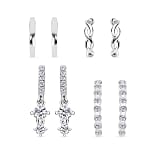 Discover luxury and versatility with our exclusive set of four earrings. Crafted from the finest silver and adorned with brilliant simulated diamonds, this collection is designed to elevate your style daily. Experience elegance with our intricately designed pieces, featuring a studded hoop, a dangling hoop, a plain huggie, and a crisscross ear cuff. Each piece boasts a hinged hoop clasp for secure and comfortable wear. Ideal for gifting or treating yourself, these earrings are an excellent addition to any silver jewelry collection.