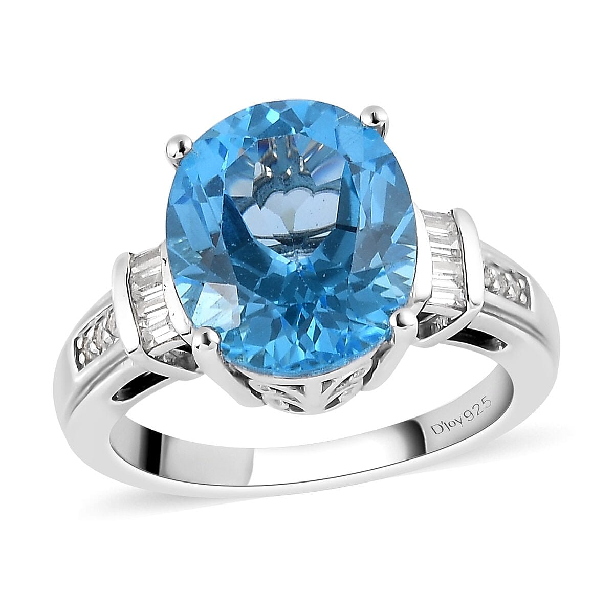 Electric Blue Topaz and White Zircon Ring in Platinum Over Sterling Silver (Size 7.0) 6.30 ctw