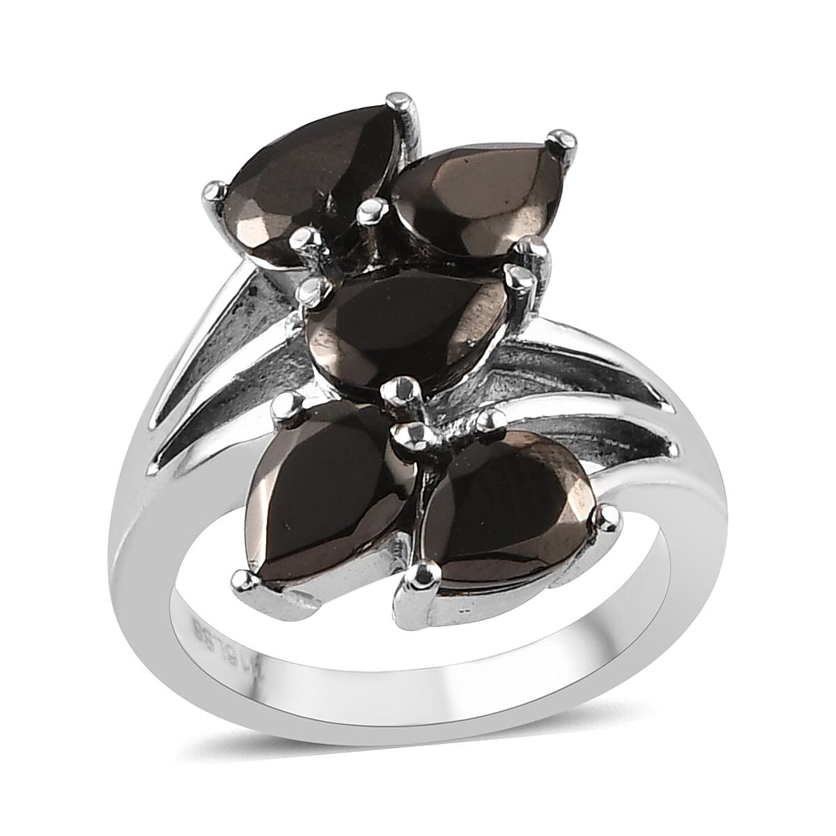 Step into the realm of exceptional elegance with our elite shungite ring. The five stone ring, set in tarnish-free stainless steel, offers a sophisticated elongated look, rendered with sleek bypass shanks. This waterproof and sweat-proof jewelry infuses style and healing energy into your daily life.