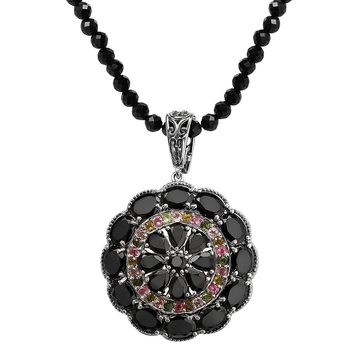 Artistically crafted and inspired by a cluster design, this Elite Shungite and multi-gemstone pendant with natural Thai black spinel beaded necklace epitomize jewelry artwork. The circular cluster floral pendant features an intricately studded, closely set Elite Shungite and multi-gemstone accents. This vibrant and creative beaded necklace with rich black and multi colors and a drill pattern chain showcase supreme craftsmanship. Crafted in platinum-plated sterling silver, this cluster pendant necklace features matinee length. The cluster pendant is not hung through a simple bail but rather an exquisite metal art bail.