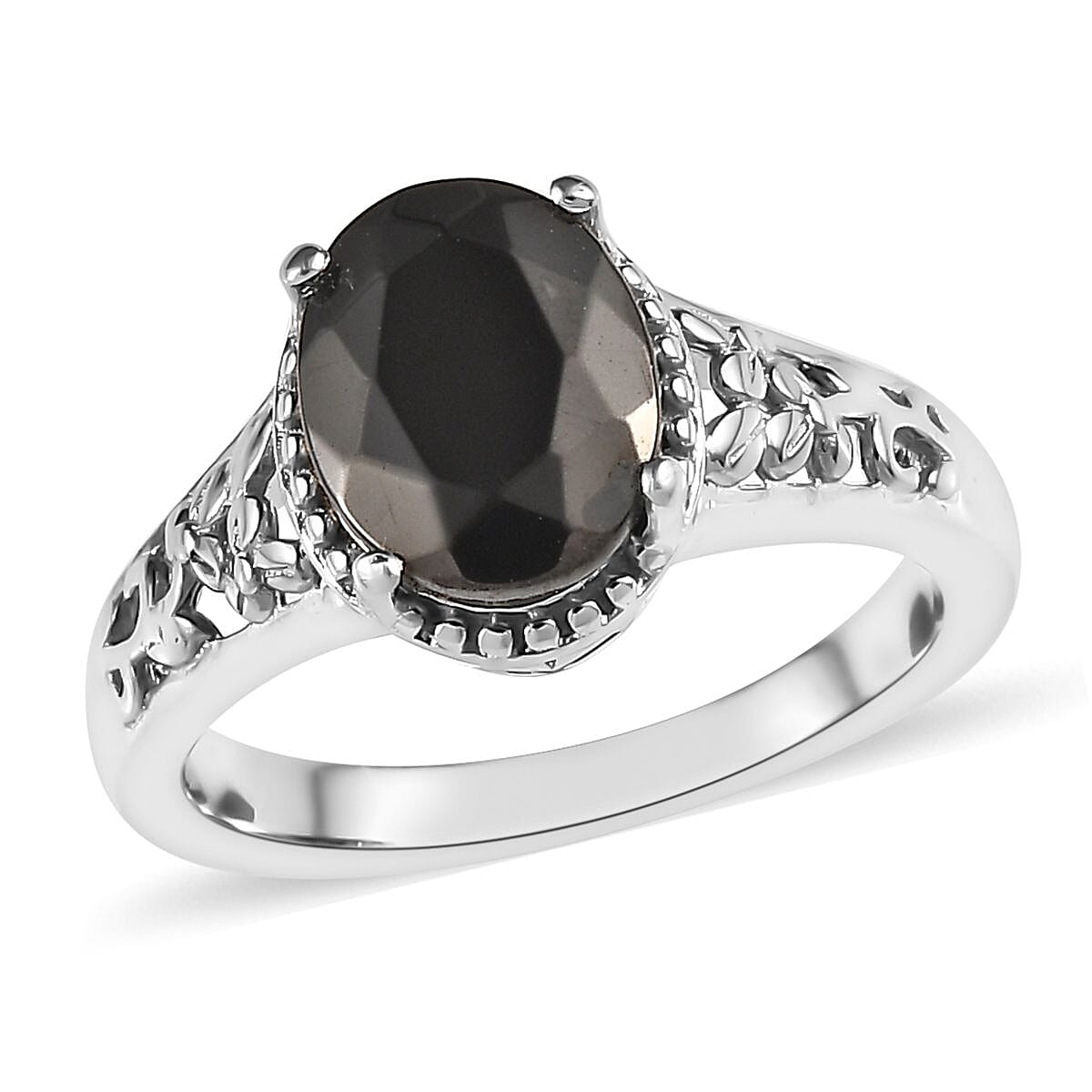 Experience the extraordinary with our elite shungite solitaire ring. This stunning piece showcases an oval-shaped gemstone held securely by prong settings. The granular metal periphery adds a touch of artisanal charm, while the floral motifs on the shank evoke a sense of natural beauty. Crafted with platinum over copper, this women’s ring combines elegance and the unique power of elite shungite.