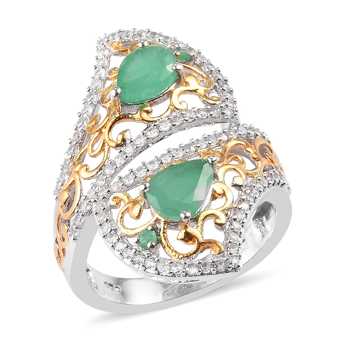 Emerald and Zircon Bypass Ring in 14K Yellow Gold and Platinum Over Sterling Silver (Size 8.0) 2.10 ctw