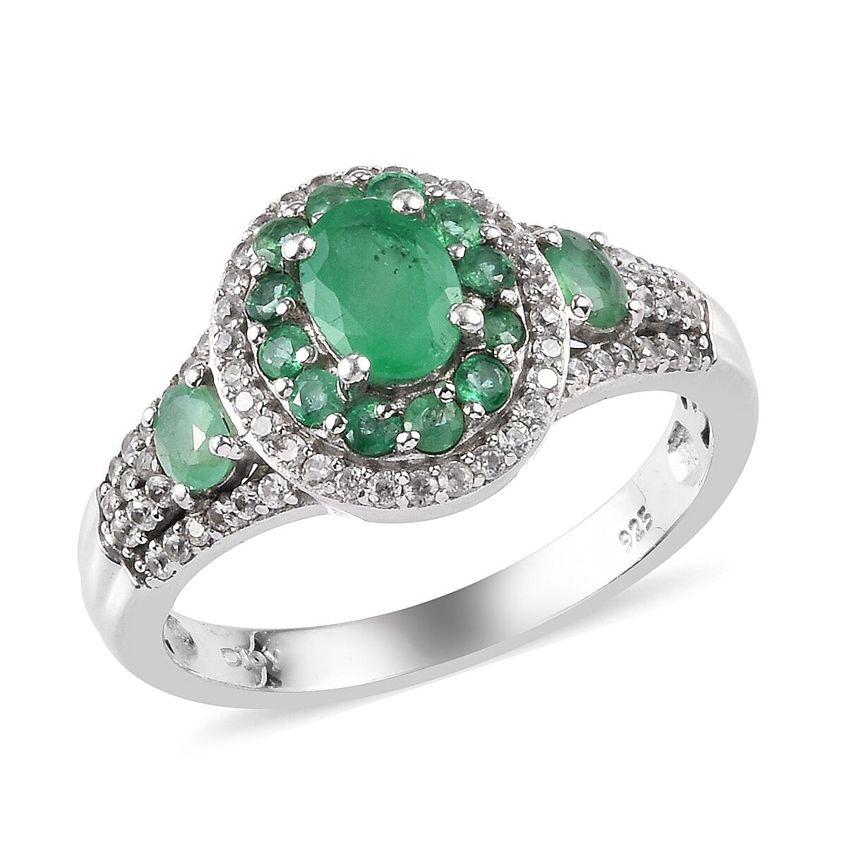 Dazzling in luscious deep green as it dangles beautifully in oval-shaped gems. This ring dazzles in emerald gemstones intricately with round zircons. It is platinum over sterling silver to secure a prong setting with high precision, an outstanding choice for that special occasion.