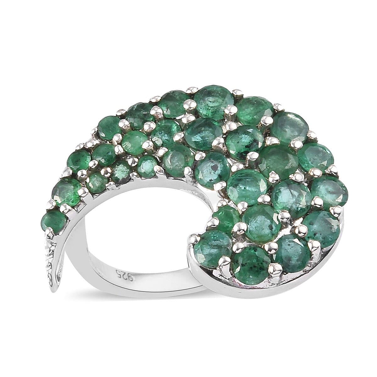 With the cluster of rounds, this emerald ring creates an awesome eye-catchy appeal. The visible prongs holding the gemstones intact create a beaded look. The asymmetric placement of the emerald gemstones forms a great design. Crafted in platinum over sterling silver, this emerald ring is hypoallergenic wear with a luminous finish. An oasis of vivid green, the emerald is the epitome of beauty. With its renewing and fresh color that soothes the soul, these gems were thought to be Queen Cleopatra’s favorite gems.