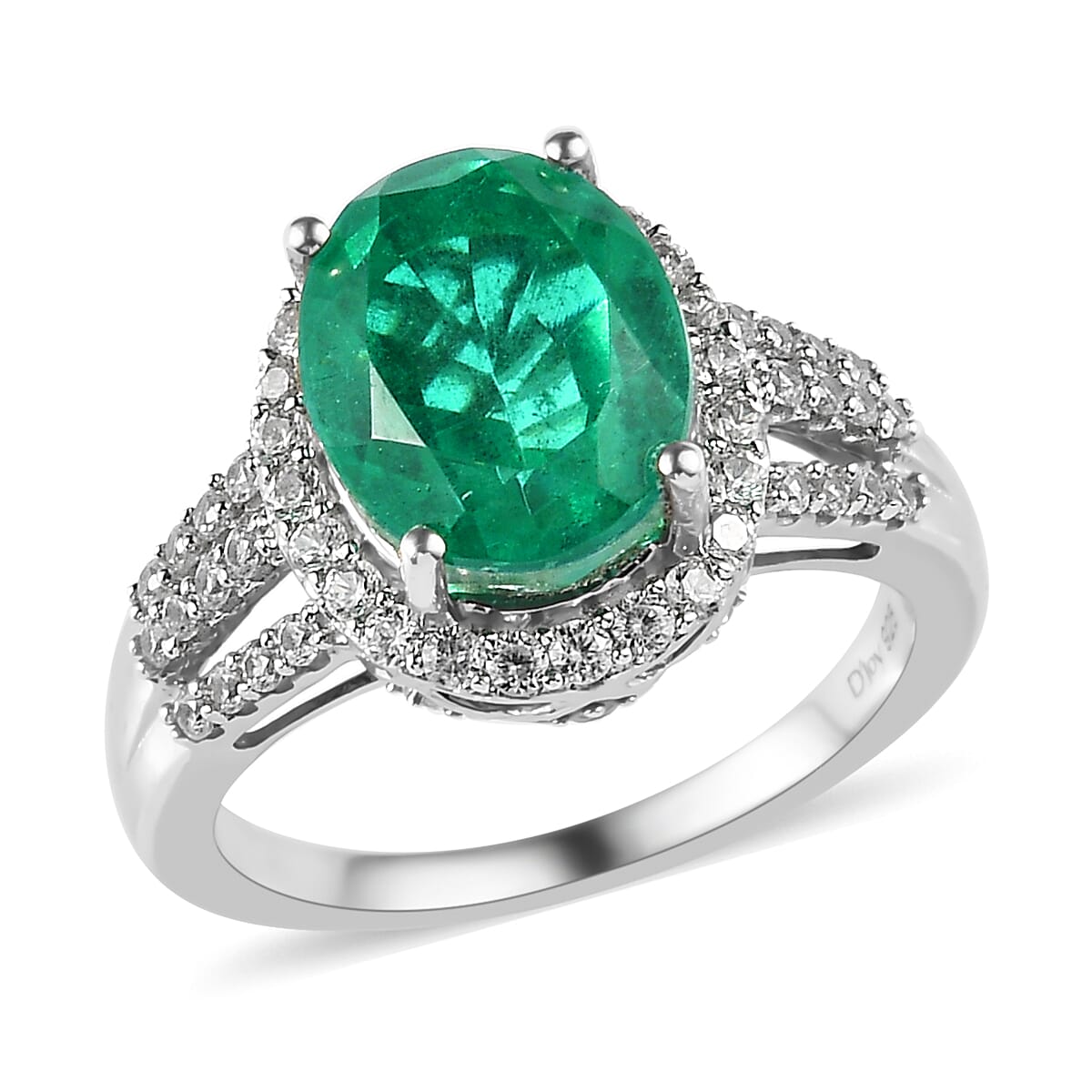 Emeraldine Quartz (Triplet) and White Zircon Split Shank Ring in Platinum Over Sterling Silver (Size 9.0) 4.35 ctw
