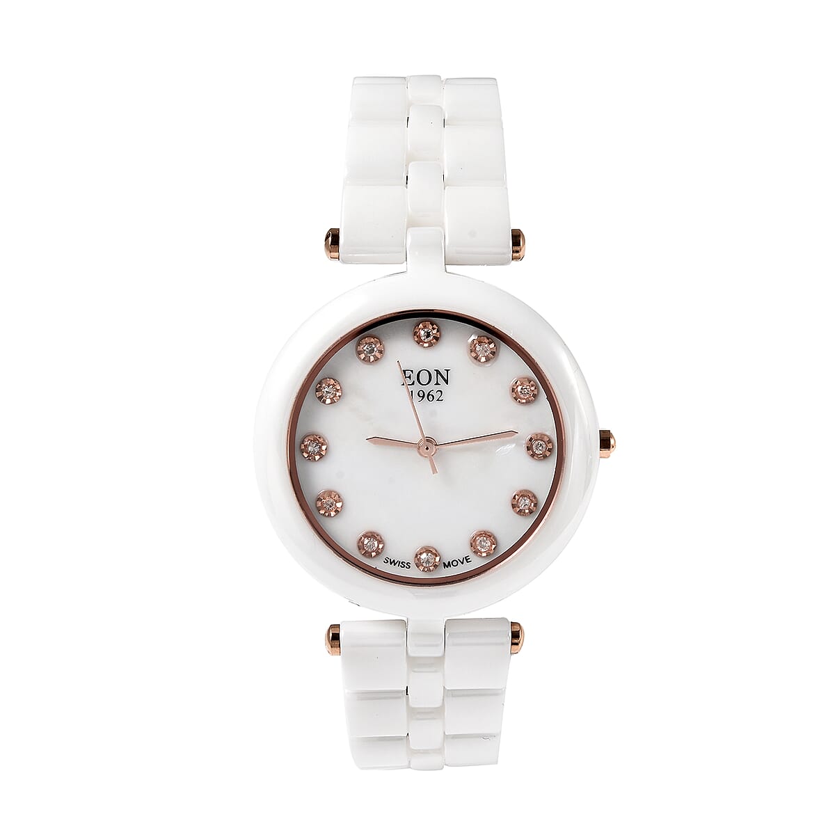 EON 1962 Diamond Swiss Movement MOP Dial Watch with White Ceramic Strap 0.10 ctw