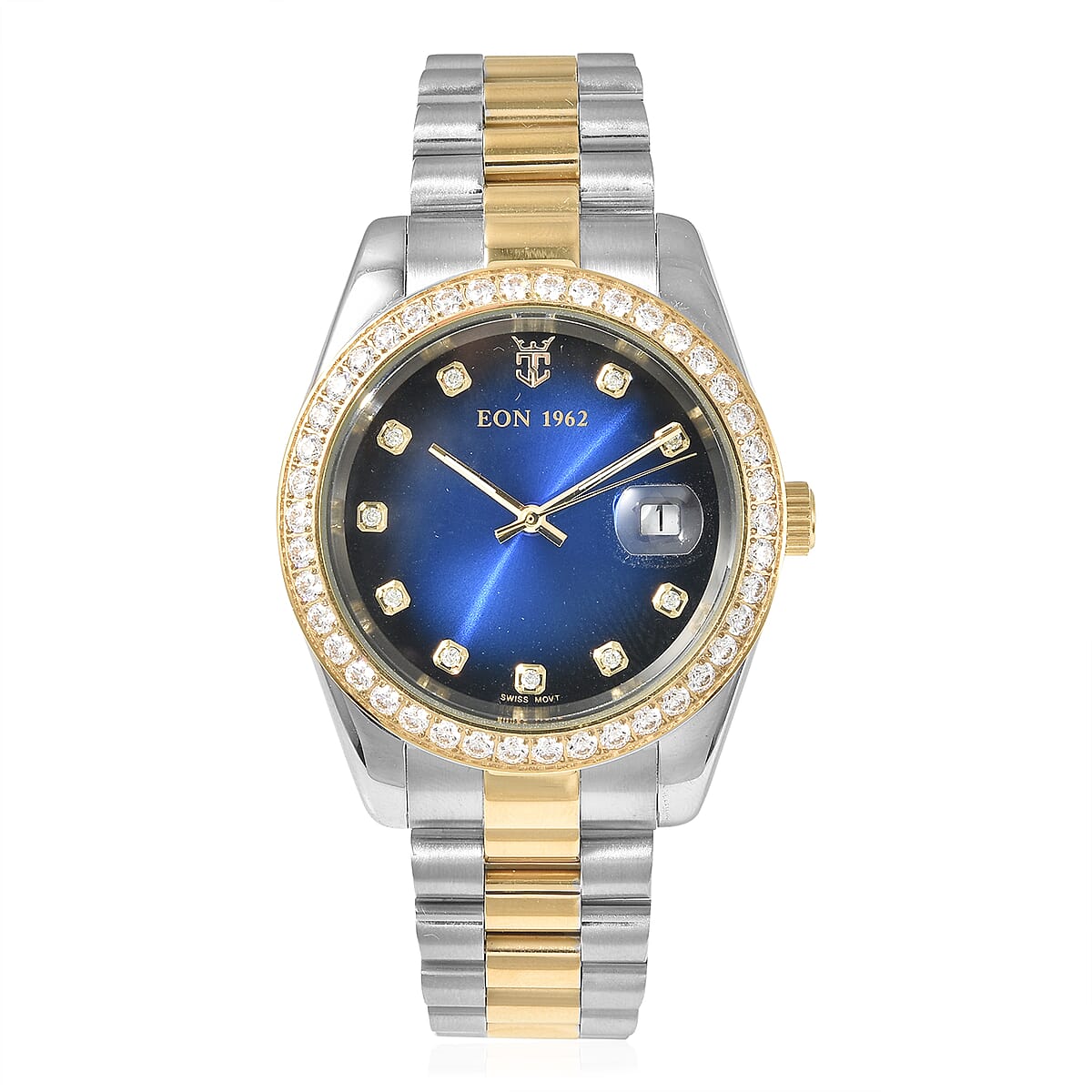 EON 1962 Made with Finest CZ Swiss Movement Blue Dial Watch in ION Plated YG and Stainless Steel with Ear Fork and Screwdriver
