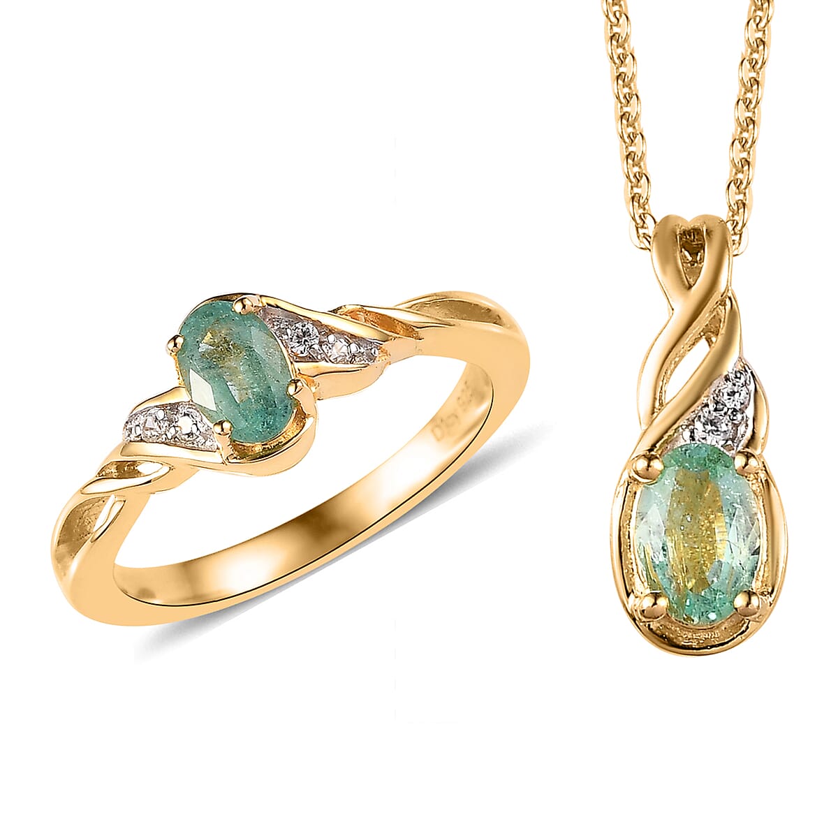 Ethiopian Emerald, White Zircon Ring (Size 8.0) and Pendant Necklace 20 Inches in Vermeil Yellow Gold Over Sterling Silver 0.90 ctw