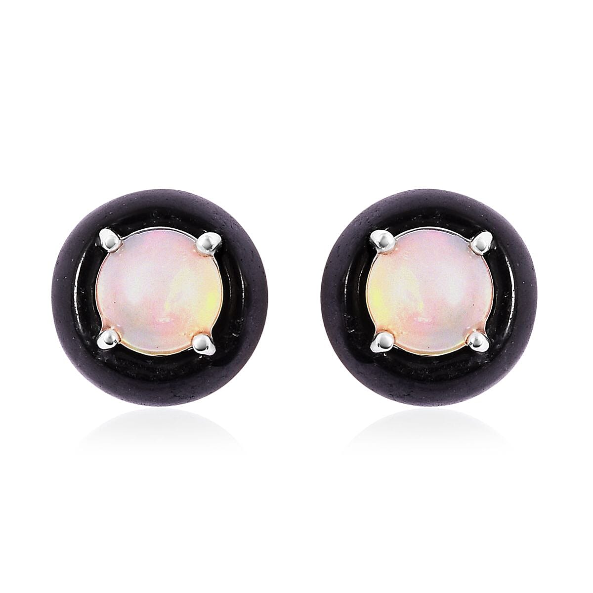 Ethiopian Welo Opal and Black Jade (D) Stud Earring in Rhodium Over Sterling Silver 11.50 ctw