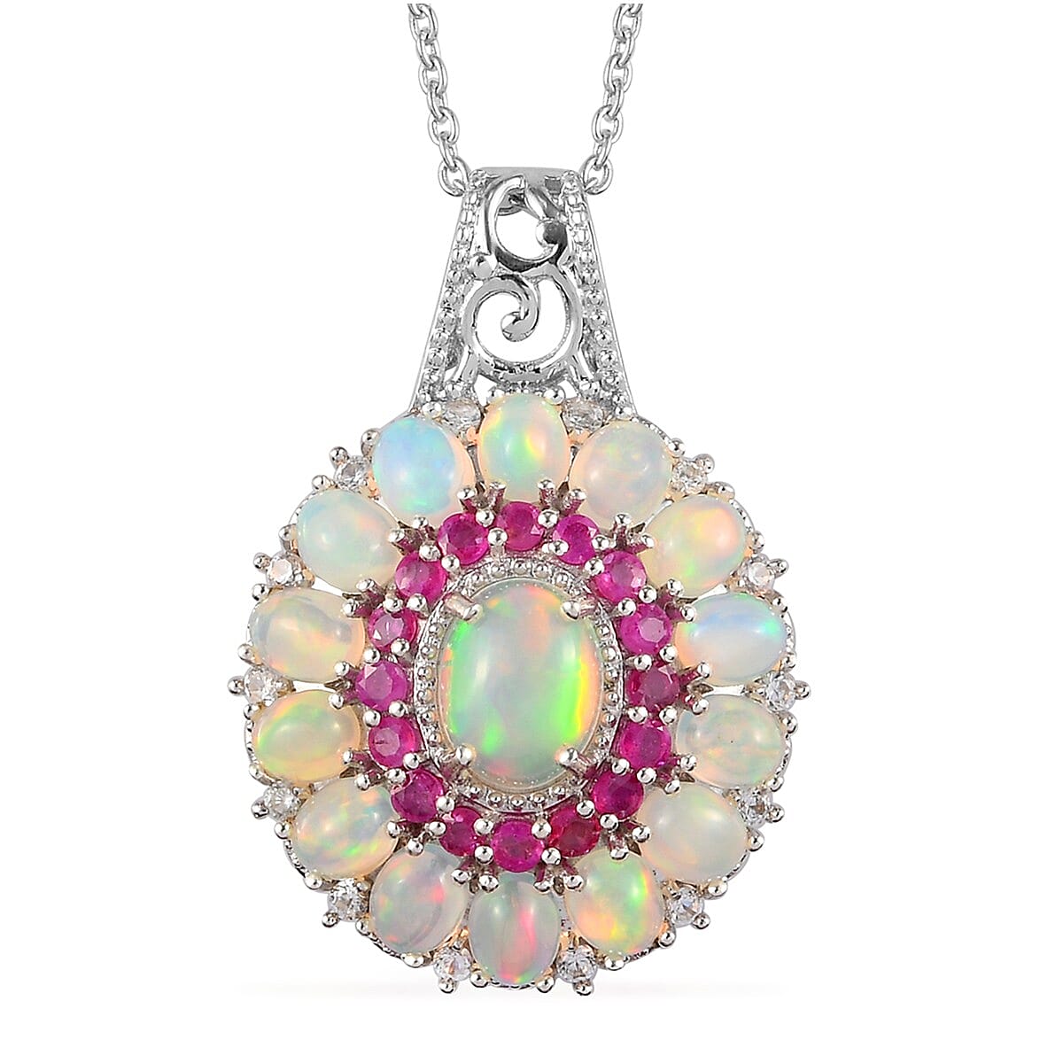 Step into a world of ethereal beauty with our Ethiopian Welo opal pendant necklace. This cocktail pendant, with its cluster design and multi gemstone accents, is a 20-inch marvel draped in platinum over sterling silver. The Ethiopian Welo opal, known for its captivating play-of-color, makes this piece a mesmerizing spectacle of light and hues. It's not just jewelry; it's a wearable masterpiece, a perfect gift that encapsulates elegance and the enchanting mysteries of opal.