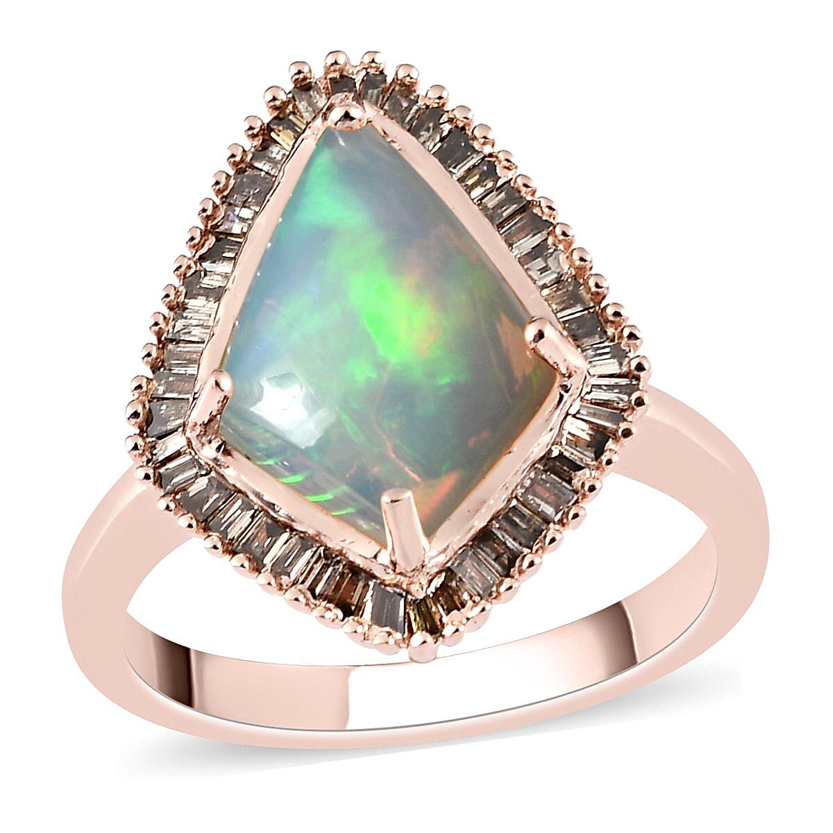 Ethiopian Welo Opal and Natural Champagne Diamond Kite Shape Halo Ring in Vermeil Rose Gold Over Sterling Silver (Size 10.0) 2.30 ctw