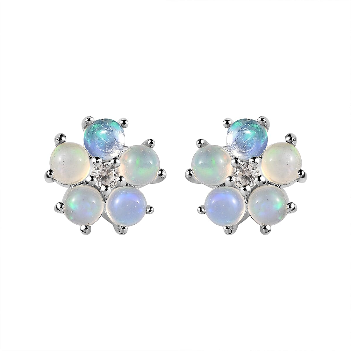 Ethiopian Welo Opal and White Zircon Floral Stud Earrings in Sterling Silver 0.90 ctw