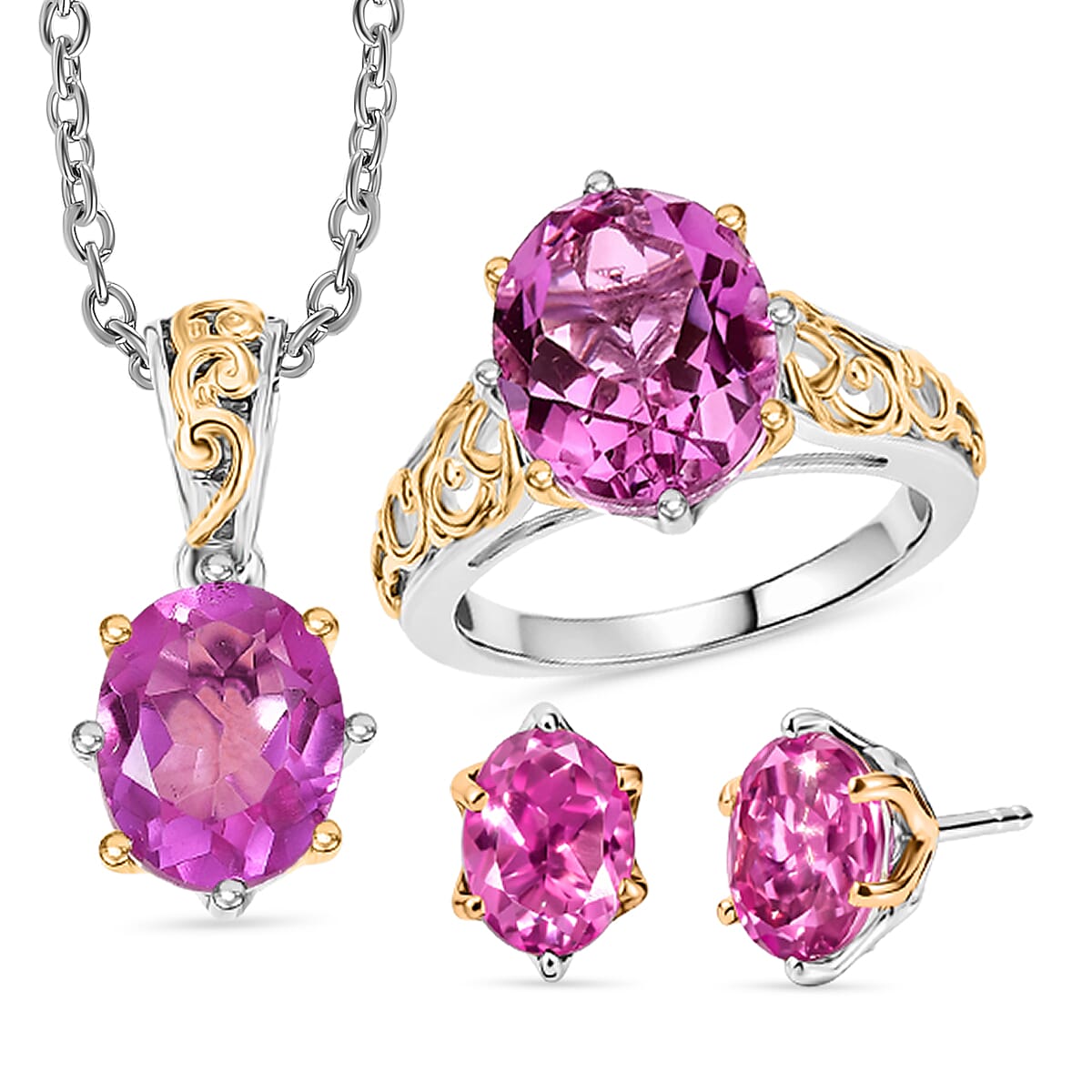 Evertrue African Lilac Quartz (Triplet) 11.10 ctw Earrings, Ring (Size 9.0) and Pendant in 18K YG Plated and Platinum Bond with Stainless Steel Necklace (20 Inches)