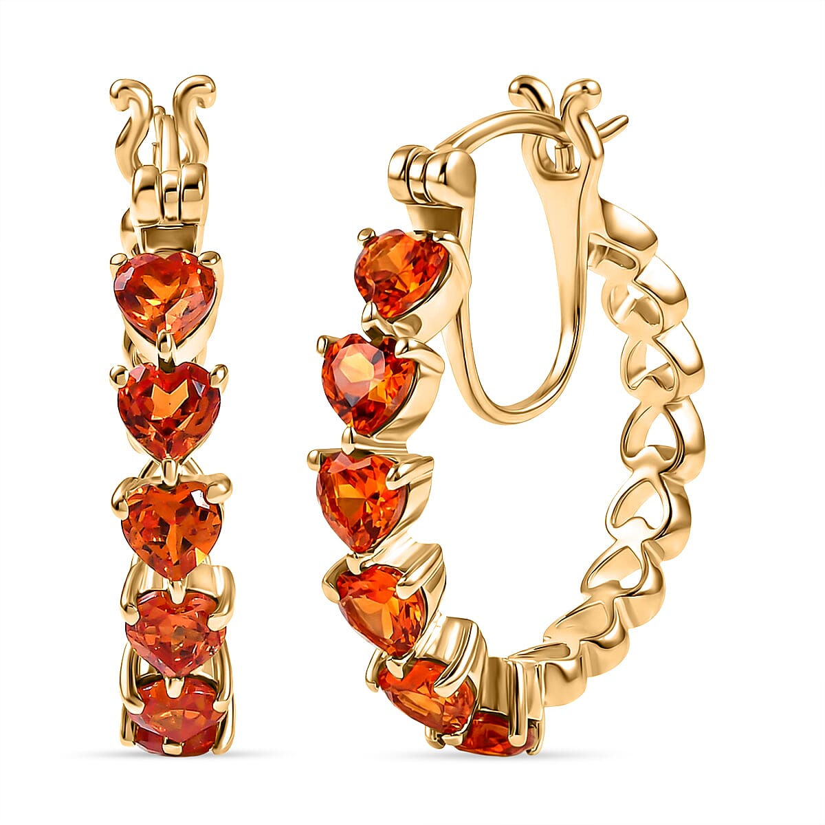 Upgrade your style with these EverTrue lab-created orange sapphire heart earrings in durable metal. These stunning hoops for women showcase vibrant orange sapphires in charming heart silhouettes. Finished in 18K yellow gold plating, they radiate warmth, brilliance, and playful elegance.