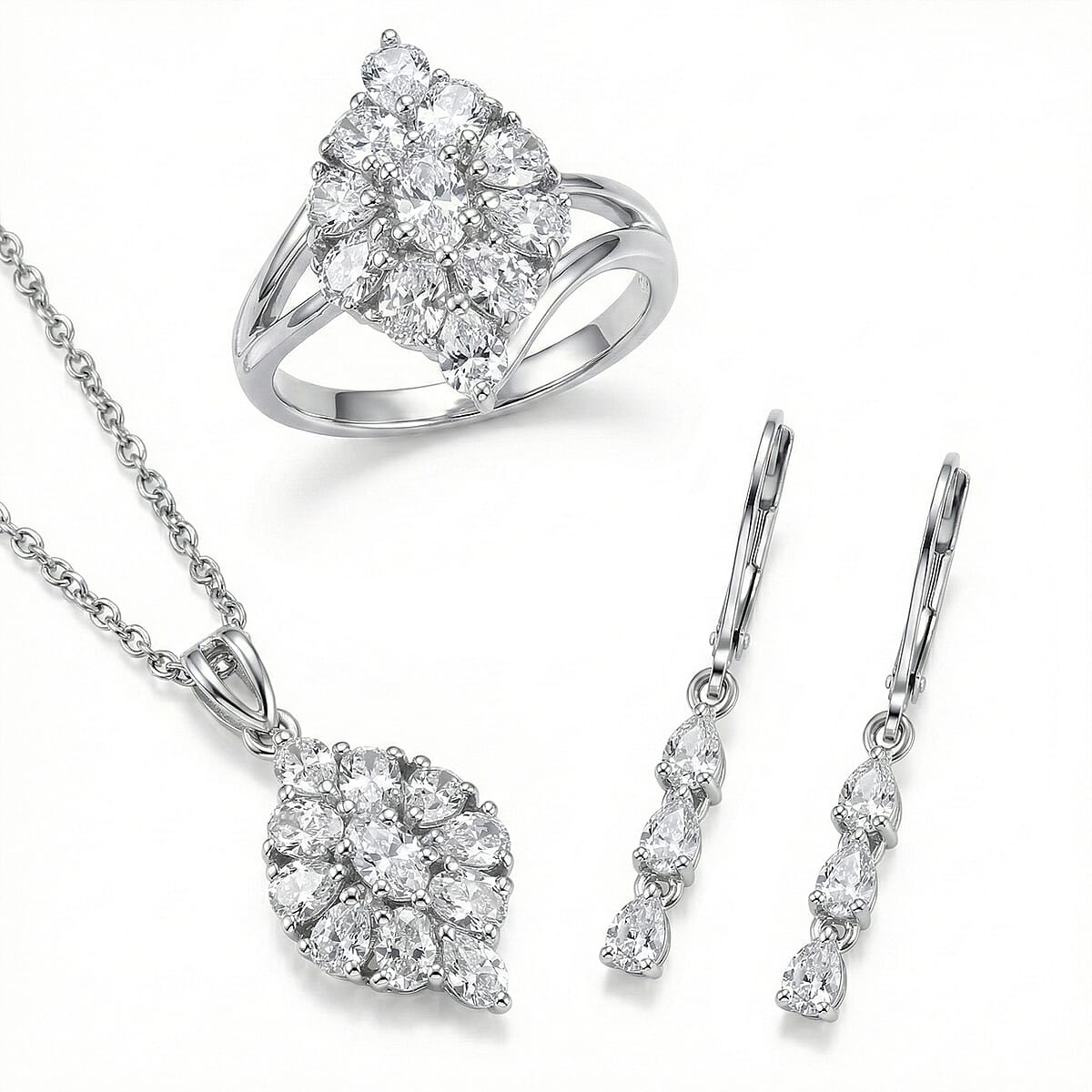 EverTrue Lab Created White Sapphire Floral Cluster Earrings, Ring (Size 5.00) and Pendant Necklace (20 Inches) in Platinum Bond and Stainless Steel 5.35 ctw