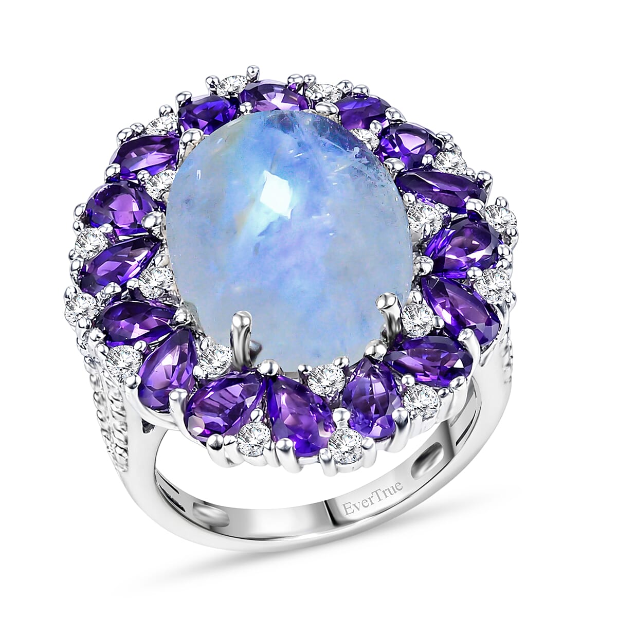 EverTrue Premium Rainbow Moonstone and Multi Gemstone 13.60 ctw Peony Floral Ring in Platinum Bond (Size 5.0)