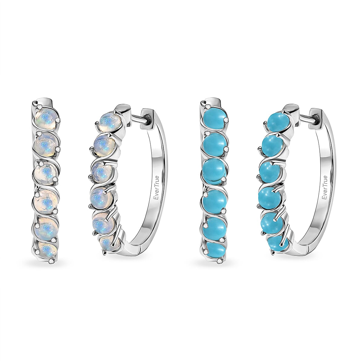 Refine your style with these EverTrue turquoise and opal set of 2 earrings in durable metal. These elegant hoop earrings feature one vibrant turquoise piece and one shimmering Welo opal piece. Platinum bond finish ensures lasting shine, adding playful elegance and color to any outfit.
