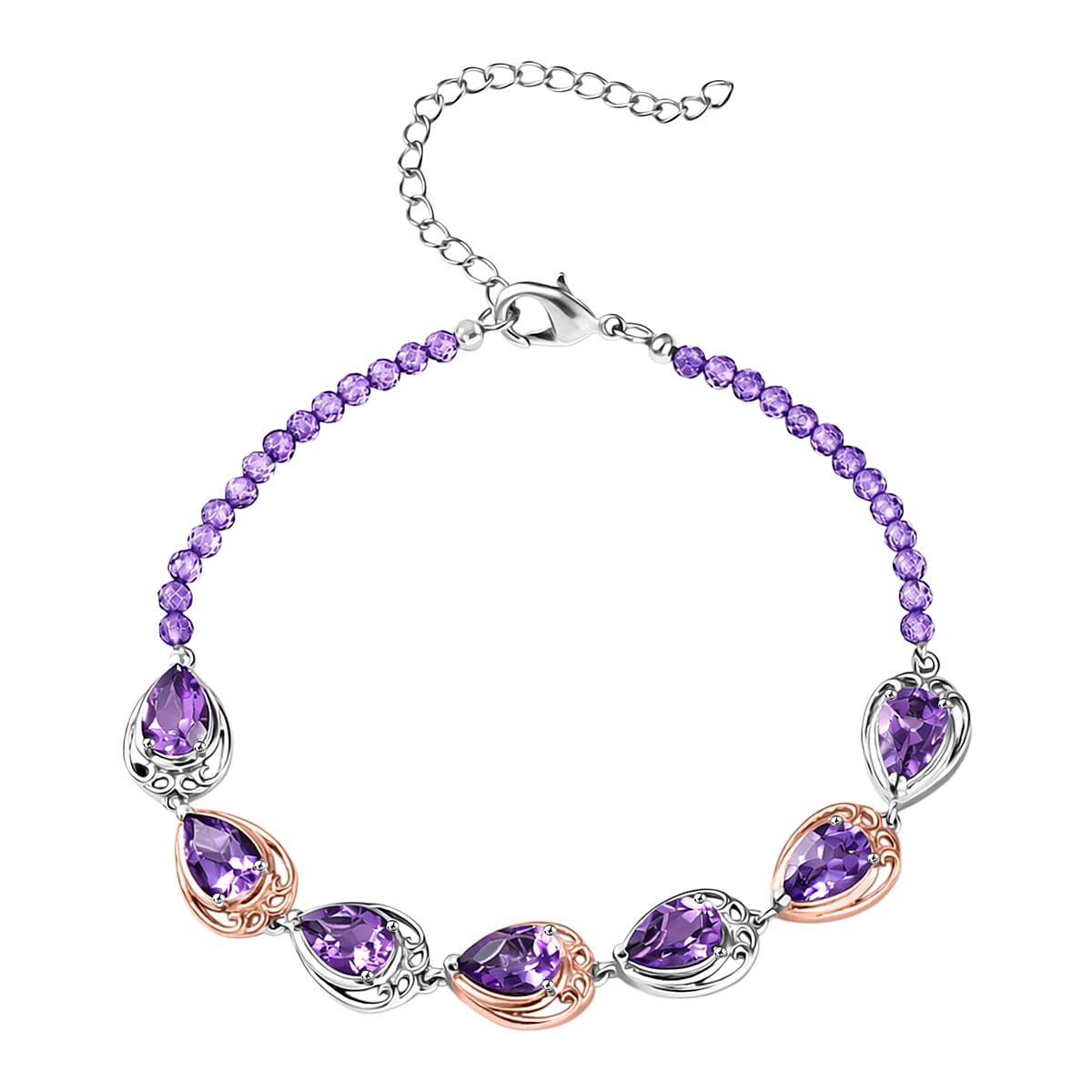 EverTrue Rose De France Amethyst and Amethyst Beaded 14.50 ctw Traveling Pear-Shape Bracelet in 18K RG Plated and Platinum Bond (8.00 In)
