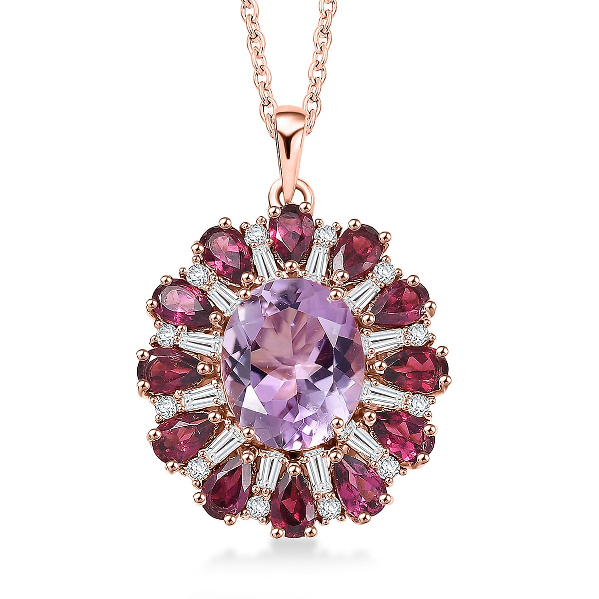 EverTrue Rose De France Amethyst and Multi Gemstone 8.60 ctw Twilight Bloom Pendant in 18K RG Plated with ION Plated RG Stainless Steel Necklace 20 Inches