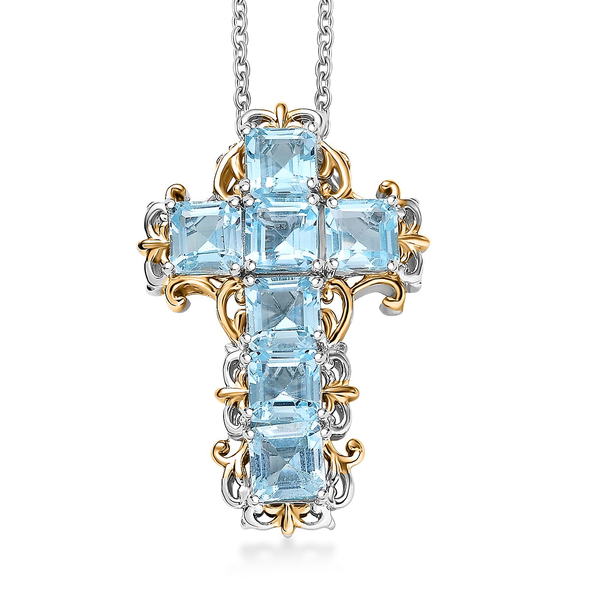 EverTrue Sky Blue Topaz 5.70 ctw Art Nouveau Cross Pendant in 18K YG Plated and Platinum Bond with Stainless Steel Necklace 20 Inches