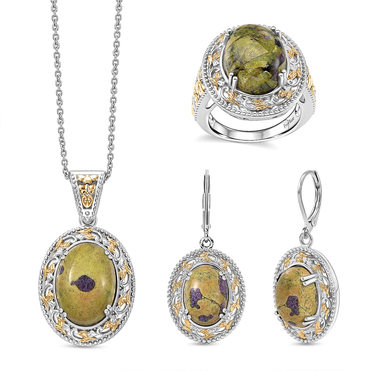 EverTrue Tasmanian Stichtite 32.00 ctw Earthstone Vintage Vine Set of Earrings, Ring (Size 6.0) and Pendant in 18K YG Plated and Platinum Bond with Stainless Steel Necklace 20 Inches