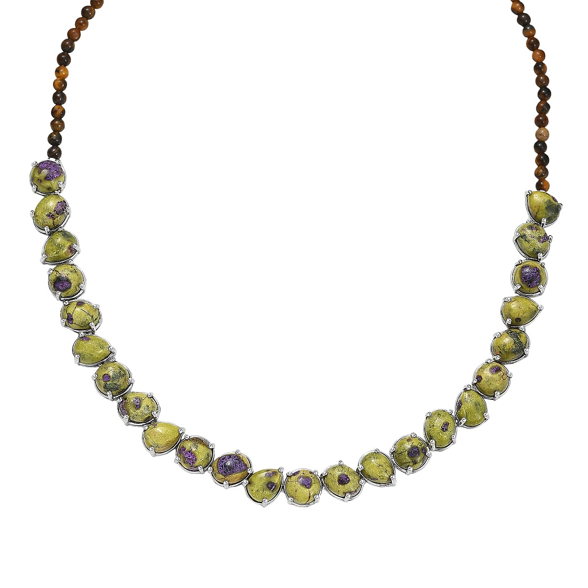 EverTrue Tasmanian Stichtite, Tigers Eye 73.40 ctw Multi Shapes Mystic Earth Link Necklace in Platinum Bond (18-20 Inches)