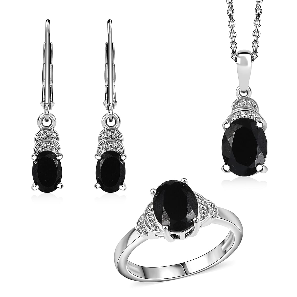 EverTrue Thai Black Spinel 6.50 ctw Earrings, Ring (Size 10.0) and Pendant in Platinum Bond with Stainless Steel Necklace 20 Inches