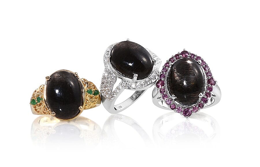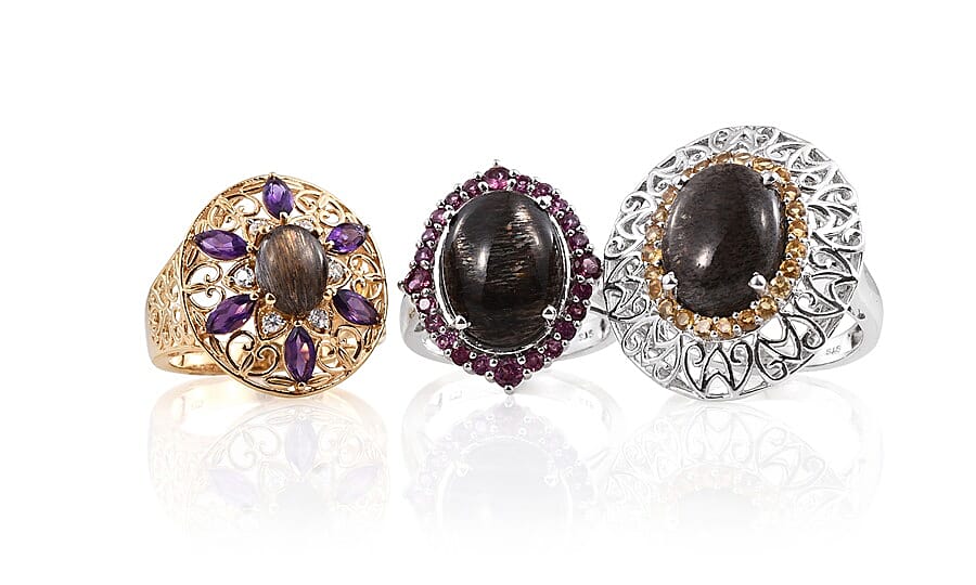 Black Feldspar can be a sophisticated gem to work. In its natural state, the rough has many fractures and cracks present, which severely reduce the yield. After mining, the desirable black and gray sections of the rough need to be separated from the brown portion. Next, matching the usable stones is a painstaking and time-consuming process. This is due to the importance of sorting stones with similar properties of fire so that the finished product is uniform in quality. Finally, the setting of the stone is critical. Stones need to be set in a way that maximizes their play of fire across the surface of the stone.