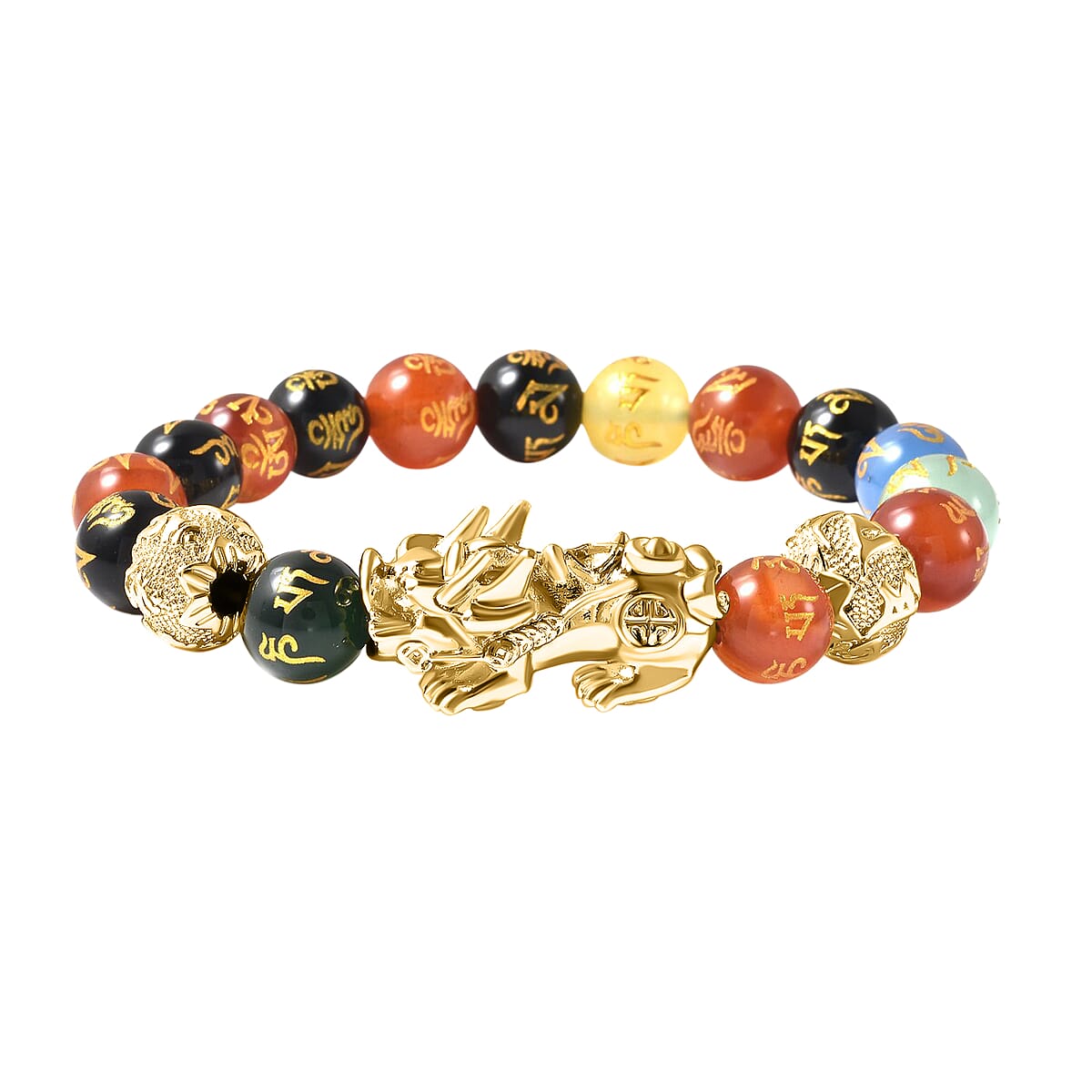 Feng Shui Pixiu Charm Multi Agate And Black Obsidian Carved Beads Stretch Bracelet in Goldtone, Stretchable Bracelet, Good Luck Birthday Gift 144.50 ctw