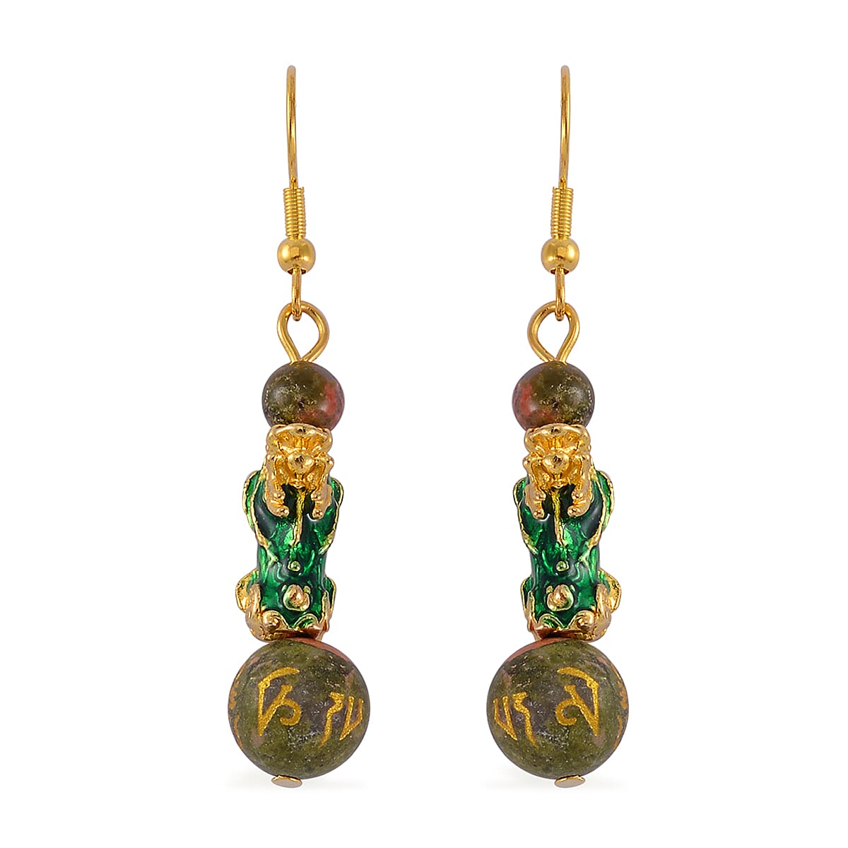 Feng Shui Unakite Beaded Pixiu Earrings in Goldtone 25.00 ctw