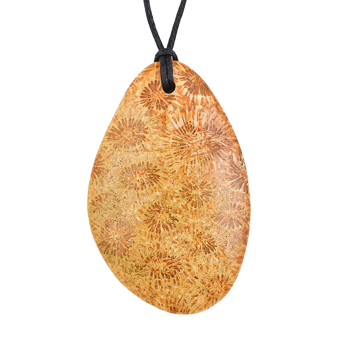 Elevate your style with this freeform hand polished coral fossil jasper with adjustable black cord necklace. This elegant fashion necklace showcases warm coral tones and natural patterns for a unique, artistic statement. Adjustable for versatility, it complements casual or layered looks with earthy, polished charm.