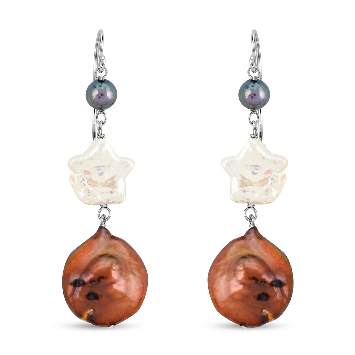 Freshwater Brown, White and Peacock Pearl Dangle Earrings in Sterling Silver