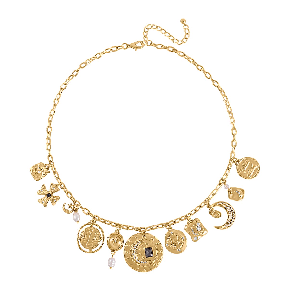 Discover the charm of our freshwater cultured pearl and multi-gemstone celestial charm necklace. It combines elegance with the mystery of celestial symbols. A secure clasp ensures it's ready for daily wear, making it a unique addition to any jewelry collection.