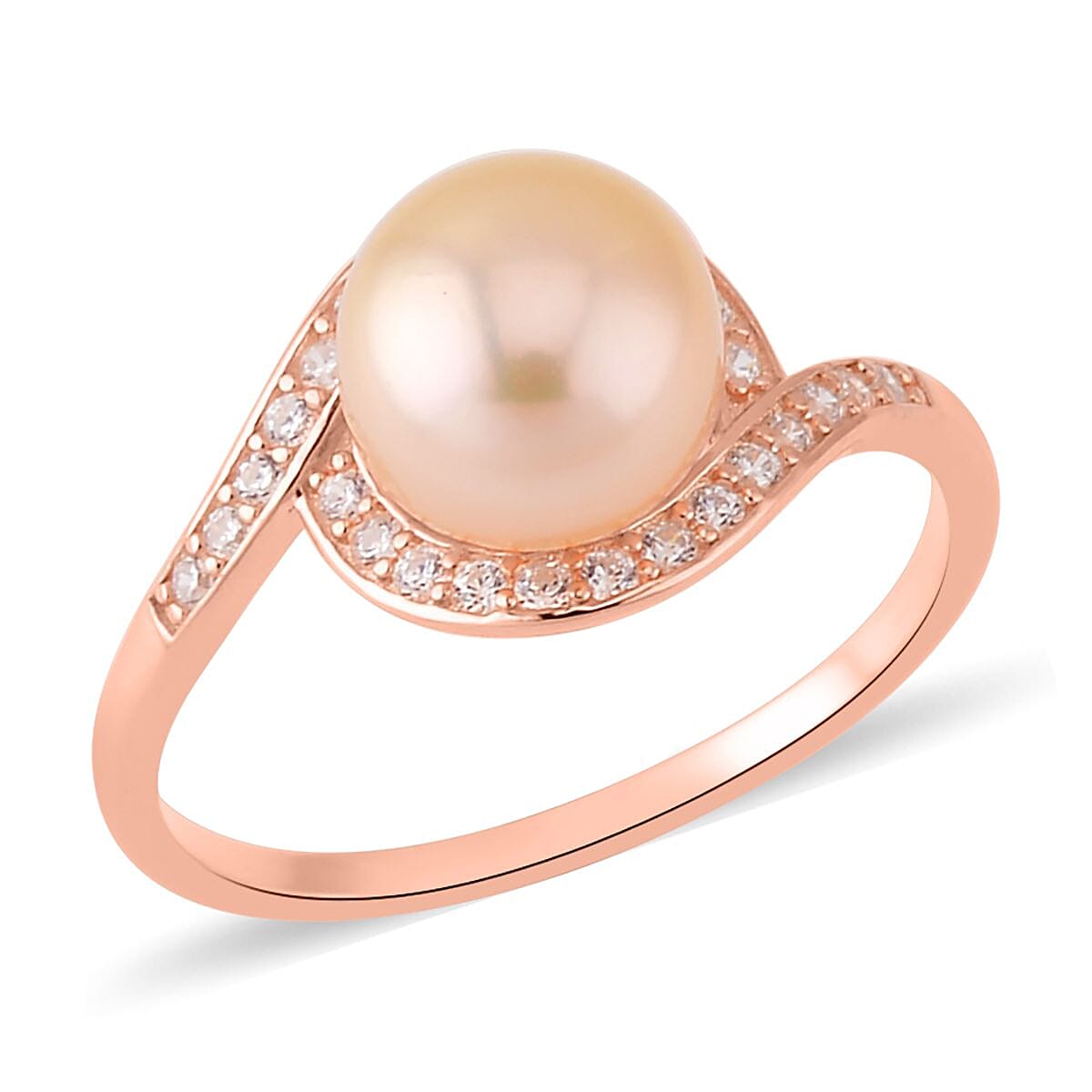 Freshwater Peach Cultured Pearl and Simulated Diamond Bypass Ring in 14K Rose Gold Over Sterling Silver (Size 7.0) 0.40 ctw