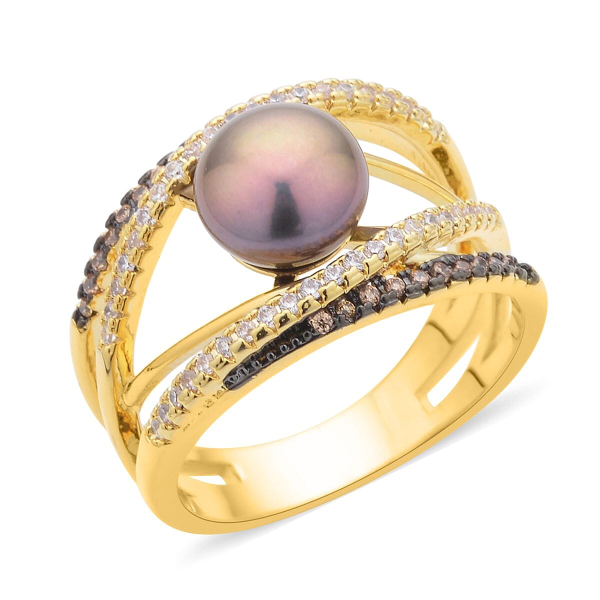Freshwater Peacock Pearl, Simulated Champagne and White Diamond Ring in Goldtone (Size 8.0) 0.90 ctw