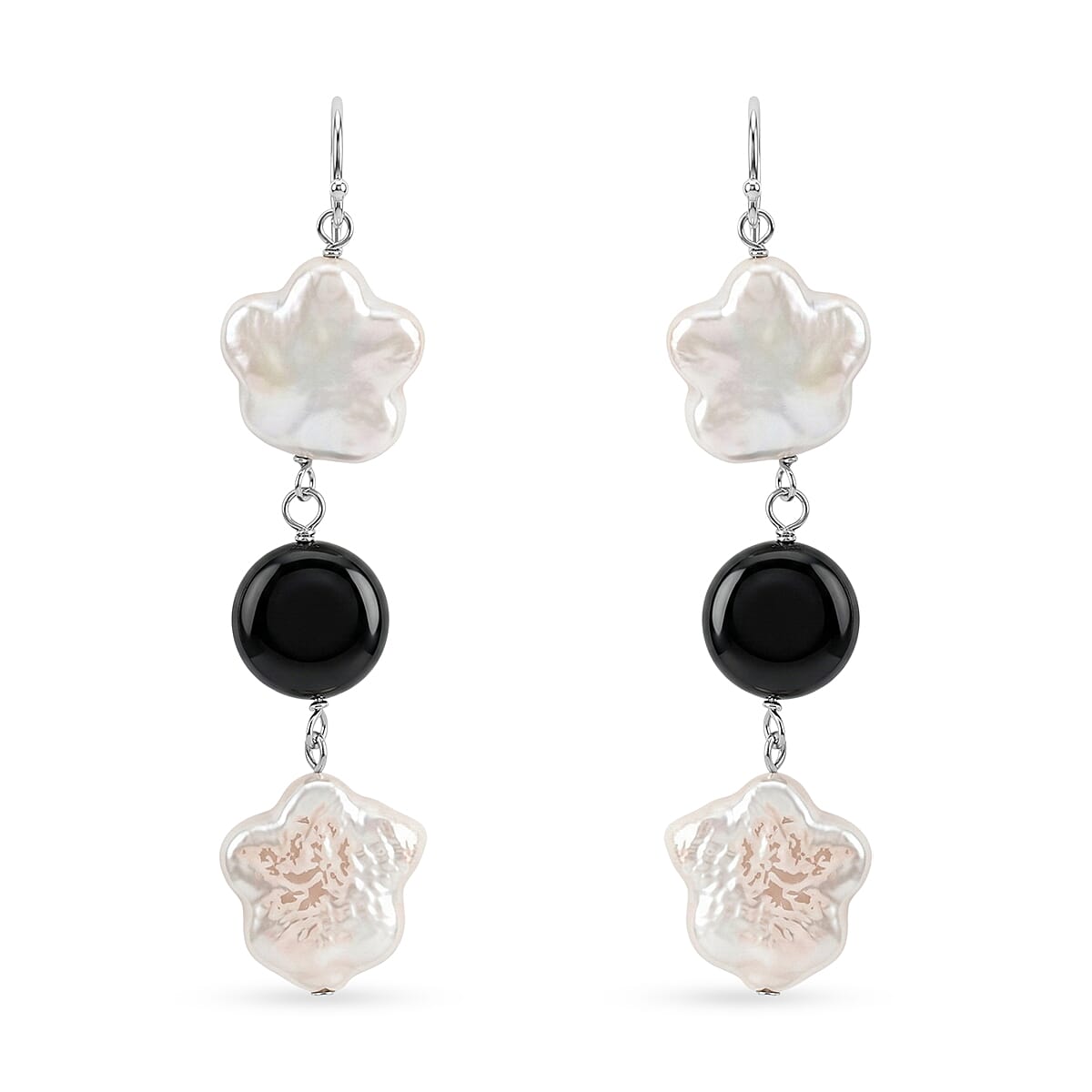 Freshwater Pearl, Black Onyx 2.10 ctw Dangle Earrings in Sterling Silver