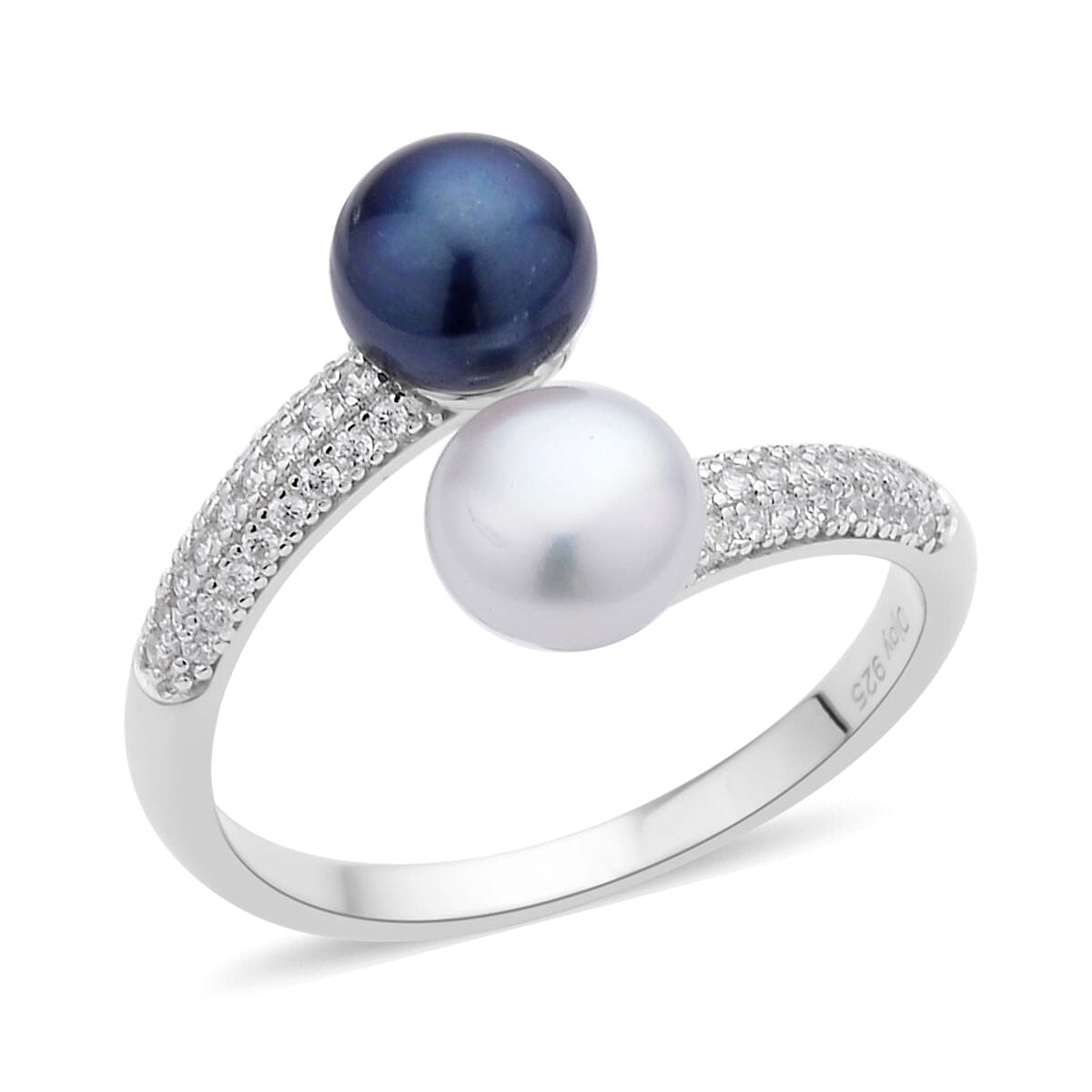 Freshwater White and Peacock Pearl and Simulated Diamond Bypass Ring in Rhodium Over Sterling Silver (Size 7.0) 0.40 ctw