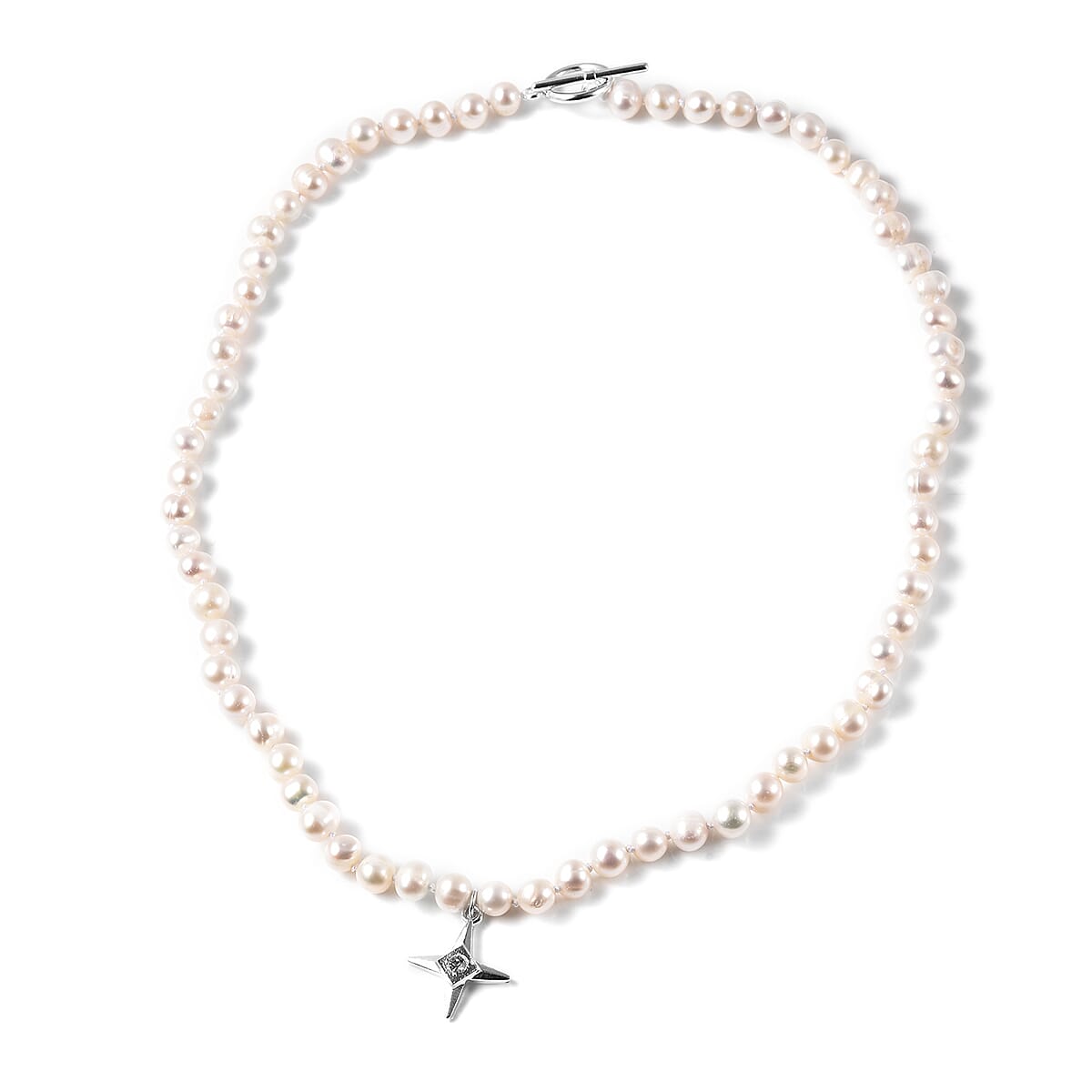 Freshwater White Cultured Pearl 6-8mm and Austrian Crystal Cross Charm Necklace 20 Inches in Silvertone