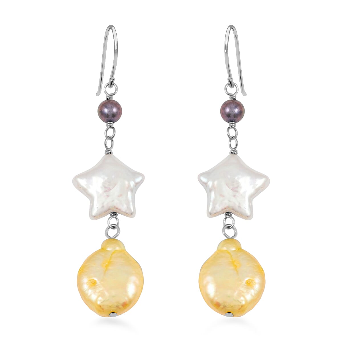 Freshwater Yellow, White and Peacock Pearl Dangle Earrings in Sterling Silver