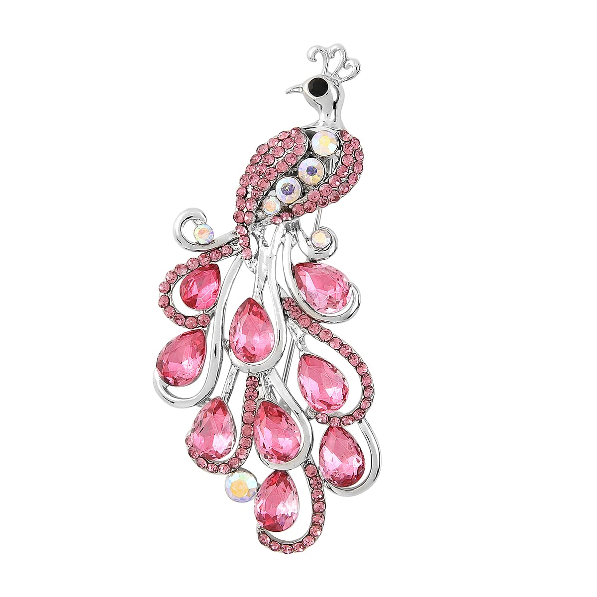 Fuchsia Glass and Multi Color Austrian Crystal Peacock Brooch in Silvertone