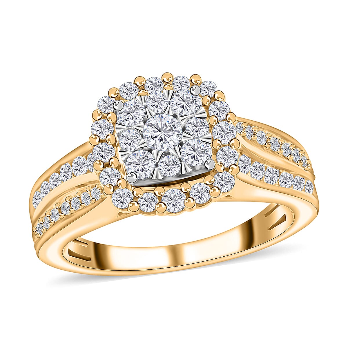 This diamond cluster ring is a harmonious blend of elegance and brilliance. Set in 10K yellow gold, this women's ring features symmetric rows of diamonds along the shank. Each diamond is carefully selected to ensure the ring's sparkle from every angle, making it a standout piece in any jewelry collection.