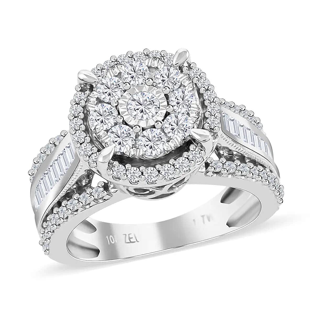 This exquisite diamond ring, crafted in 10k white gold, features a striking cluster of round gems at its center, beautifully complemented by tapered baguette-shaped diamonds along the shank. This elegant white gold diamond ring is a timeless expression of love and admiration, sure to make her feel truly cherished.