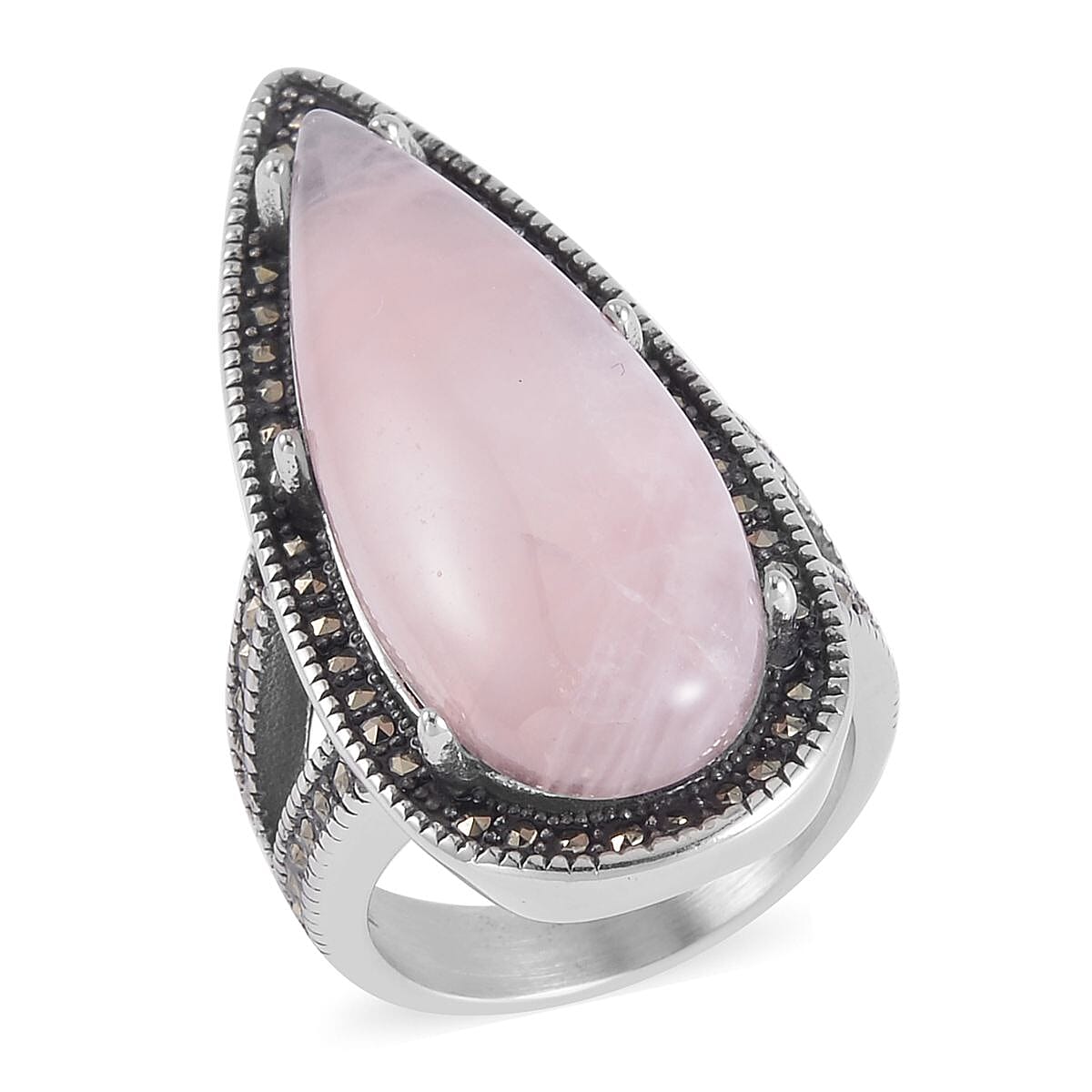 Indulge in the ethereal charm of our Galilea rose quartz ring. This mesmerizing halo design showcases a pear-shaped rose quartz enveloped by a halo of Mosaic stones. Set in black oxidized stainless steel, it offers an allure as enduring as it is breathtaking. Make a statement that defies time and trend.