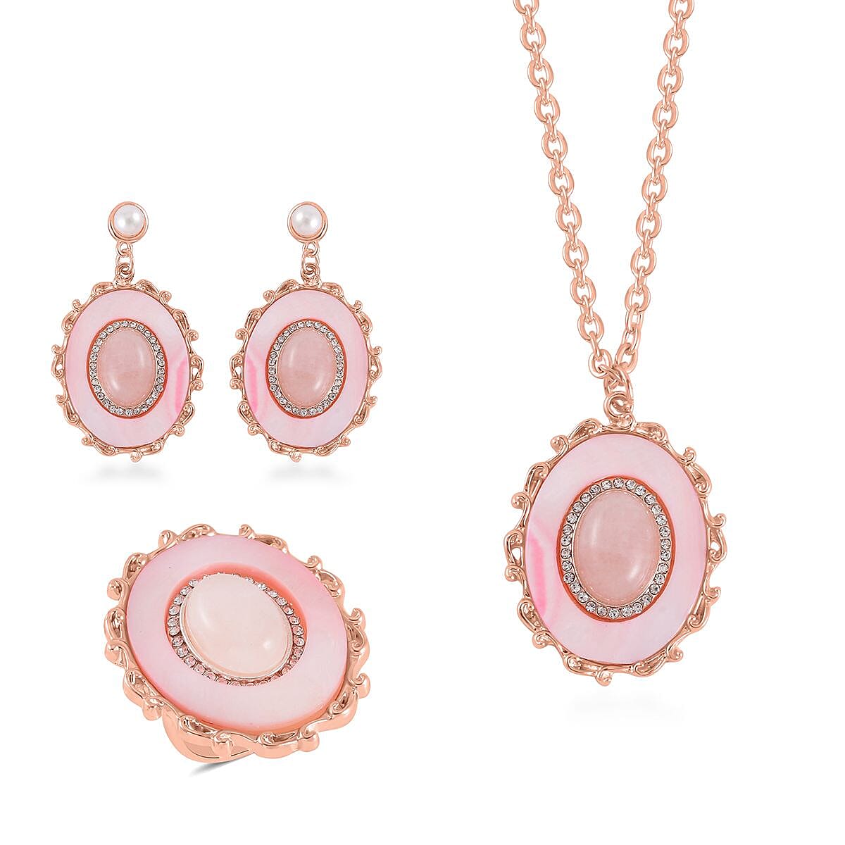 Galilea Rose Quartz and Multi Gemstone Drop Earrings, Ring Size 11.0 and Pendant in Rosetone with ION Plated RG Stainless Steel Necklace 20 Inches 16.00 ctw