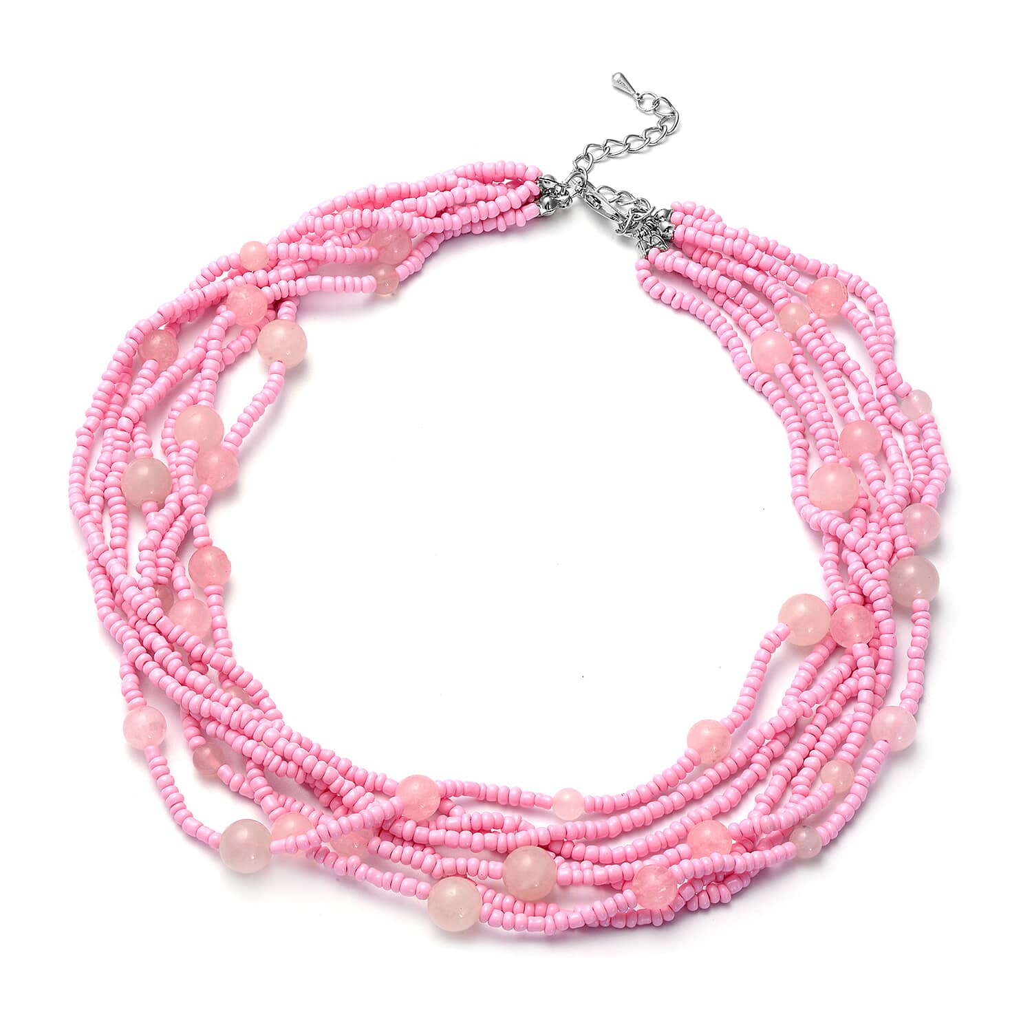 Galilea Rose Quartz and Simulated Pink Pearl Twisted Multi Row Beaded Station Necklace 18-20 Inches in Silvertone 144.50 ctw