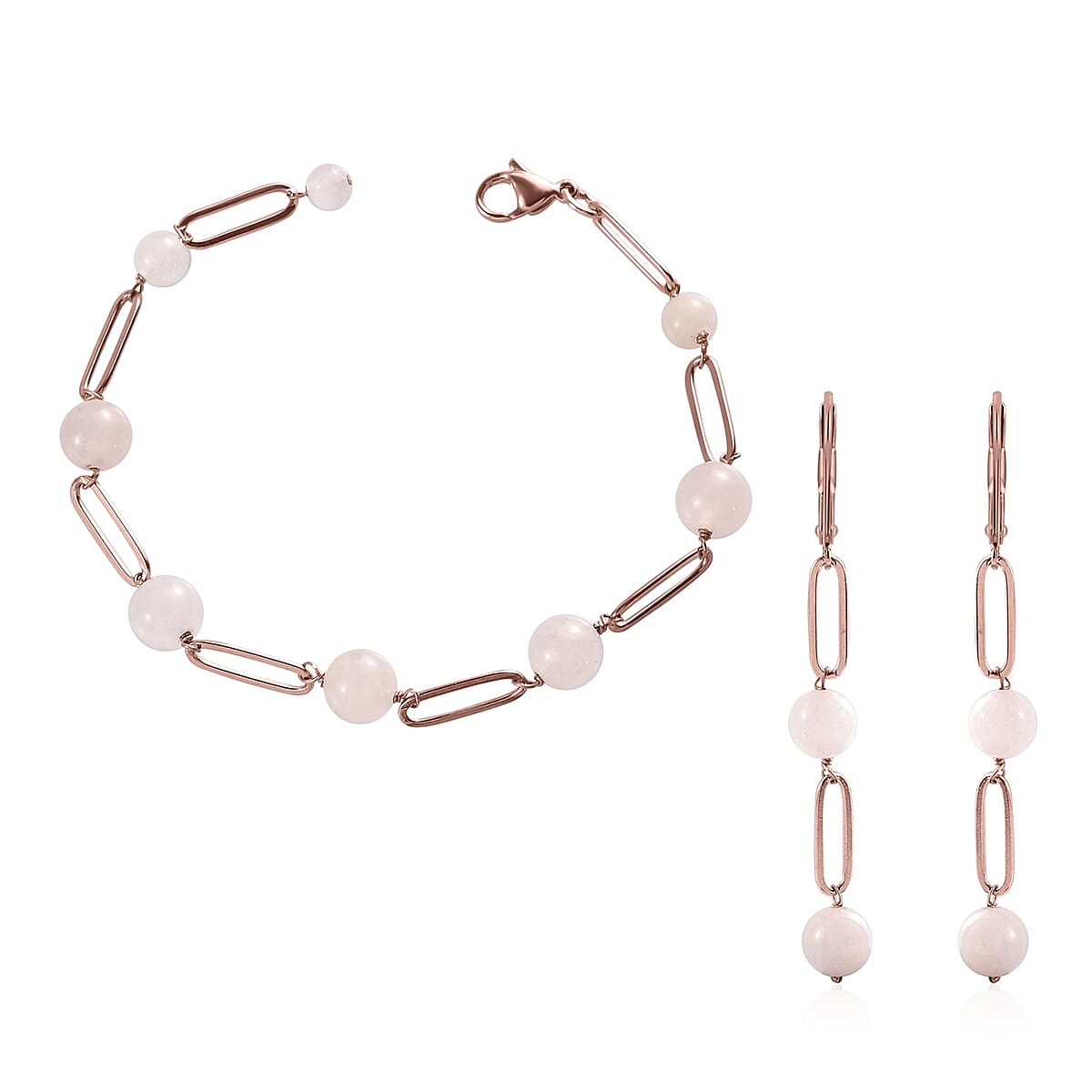 Galilea Rose Quartz Paper Clip Chain Station Bracelet (8In) and Earrings in ION Plated RG Stainless Steel 34.15 ctw | Tarnish-Free, Waterproof, Sweat Proof Jewelry